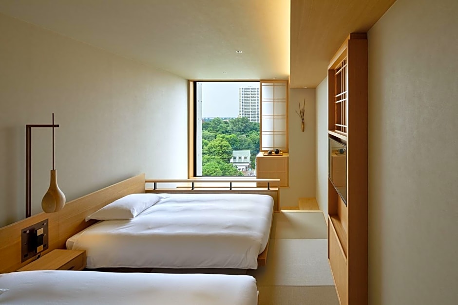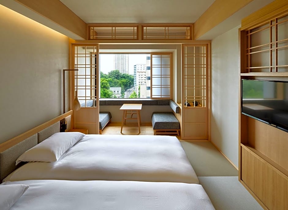 The twin room features tatami floors, a seating area with a flat-screen TV, air conditioning, a tea and coffee maker as well as city views. The unit offers 2 beds.